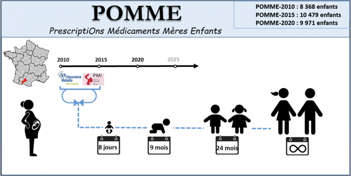 POMME est une cohorte française, qui détient des informations médicales anonymes ainsi que des informations sur les médicaments et les soins de santé remboursés aux enfants, à partir du jour de leur conception (vie intra-utérine) jusqu'à leur enfance. La cohorte POMME est constituée des enfants couverts par le régime général de l’assurance maladie, nés en Haute-Garonne pendant une année (entre le 1er juillet et le 30 juin) tous les 5 ans. POMME inclue actuellement des enfants nés en 2010, 2015 et 2020. Les effectifs sont respectivement de 8 368, 10 479 et 9 971 enfants.